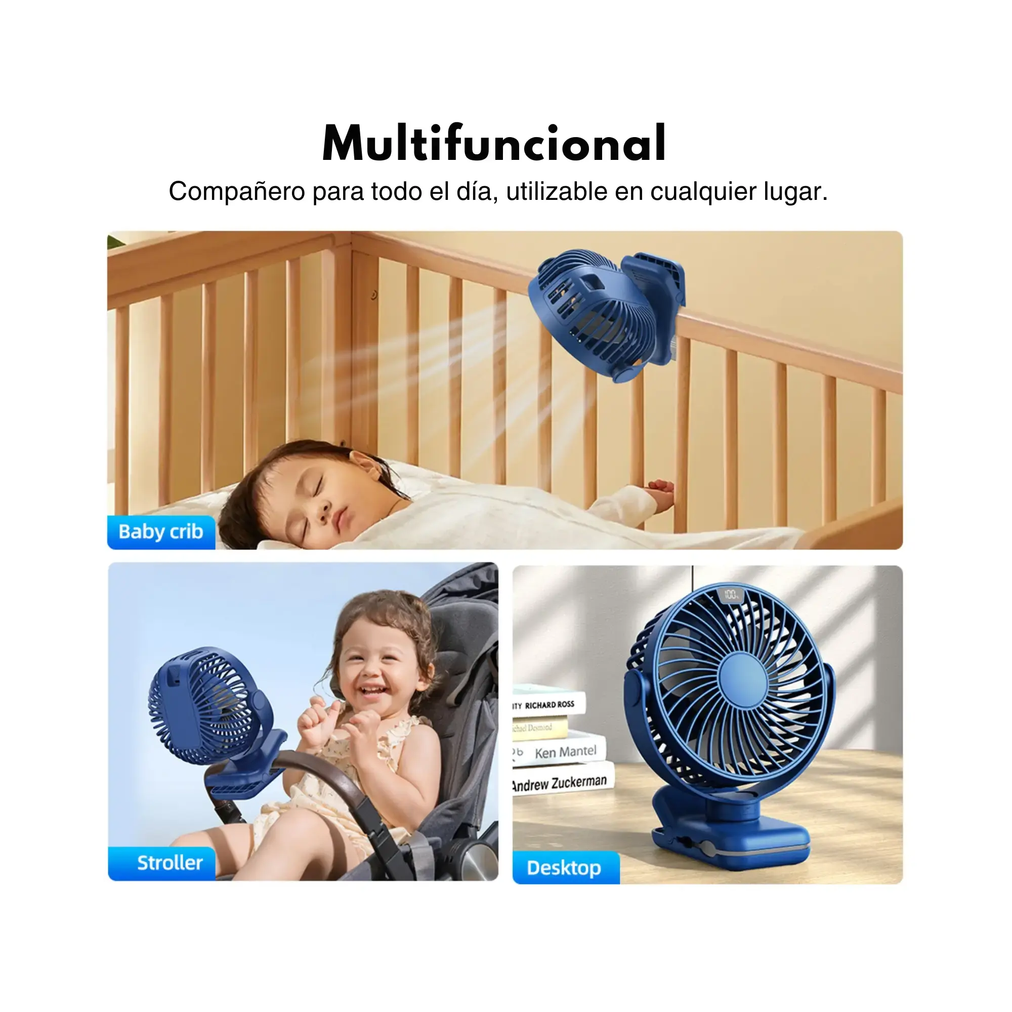 Ventilador portátil con batería de gran capacidad, motor brushless y carga rápida Type-C. Compacto y ligero, con display LED y clip ultra-fuerte, ideal para uso en casa, oficina, coche, cuna de bebé o cochecito.