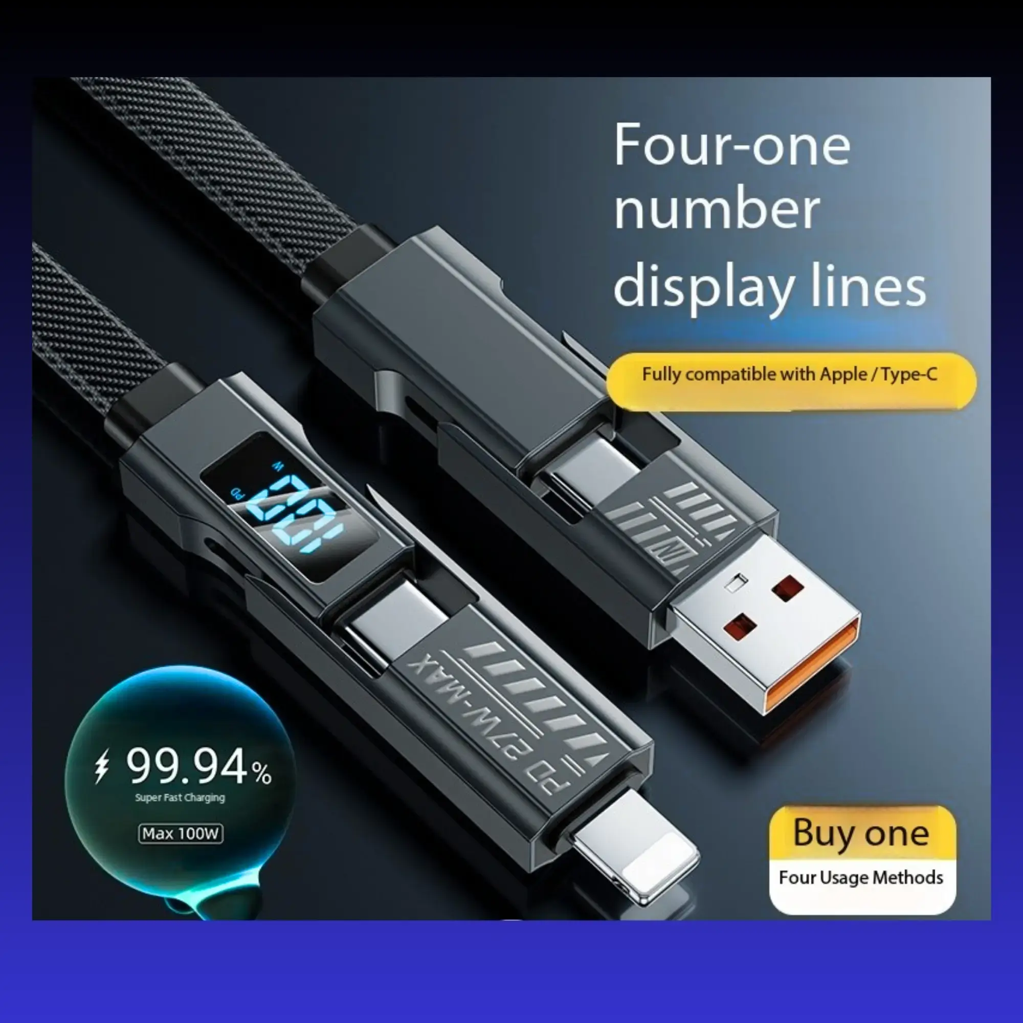 Cable 4-en-1 con pantalla digital para monitorear la carga. Compatible con Type-C, Lightning y USB-A, soporta hasta 100W de potencia sin dañar tus dispositivos. Diseño trenzado duradero y protección inteligente para máxima seguridad.