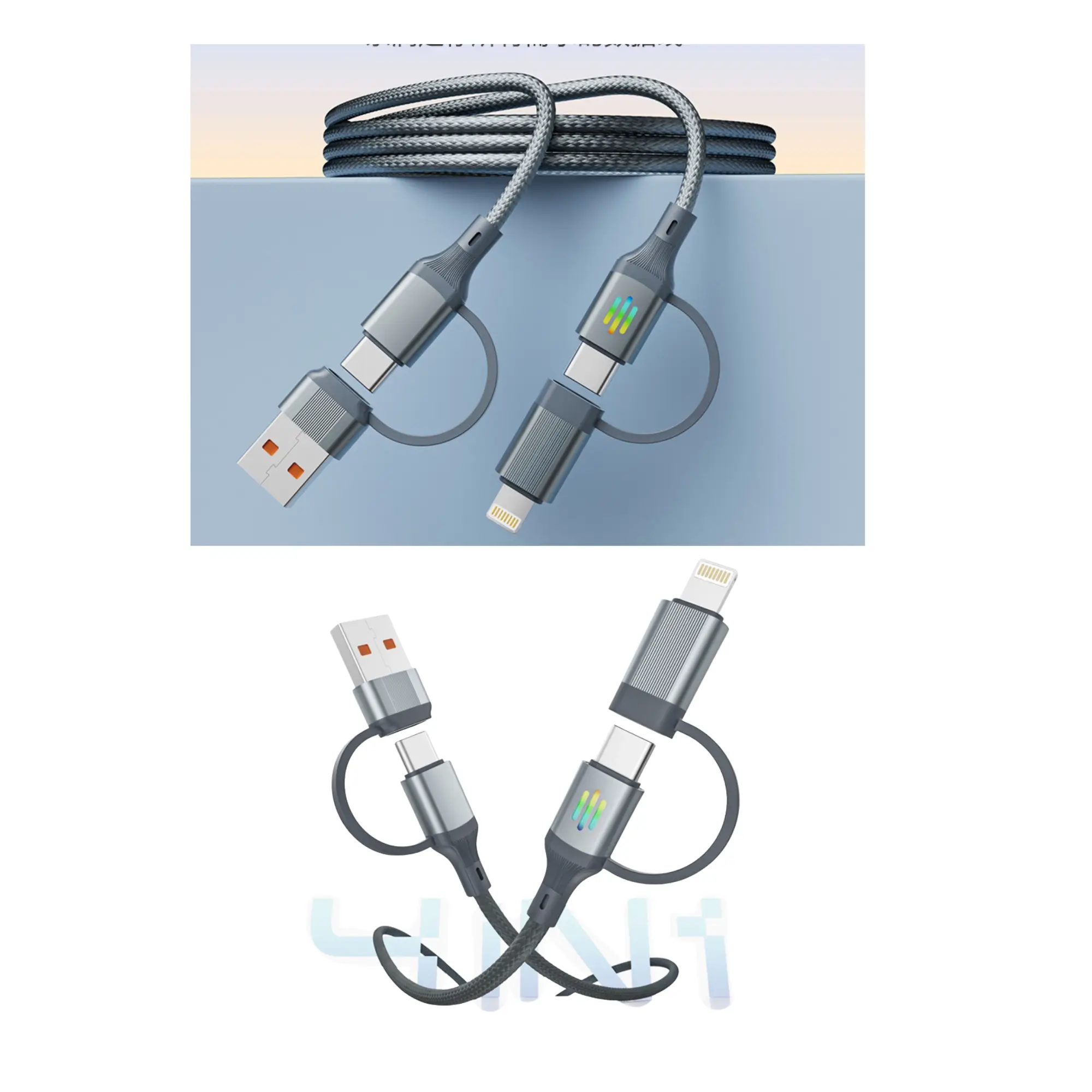 Cable 4 en 1 de silicona trenzada con luces RGB, compatible con todos tus dispositivos. Soporta carga rápida hasta 65W y transferencia segura de datos. Incluye funda cilíndrica transparente con gancho para organización y transporte fácil.